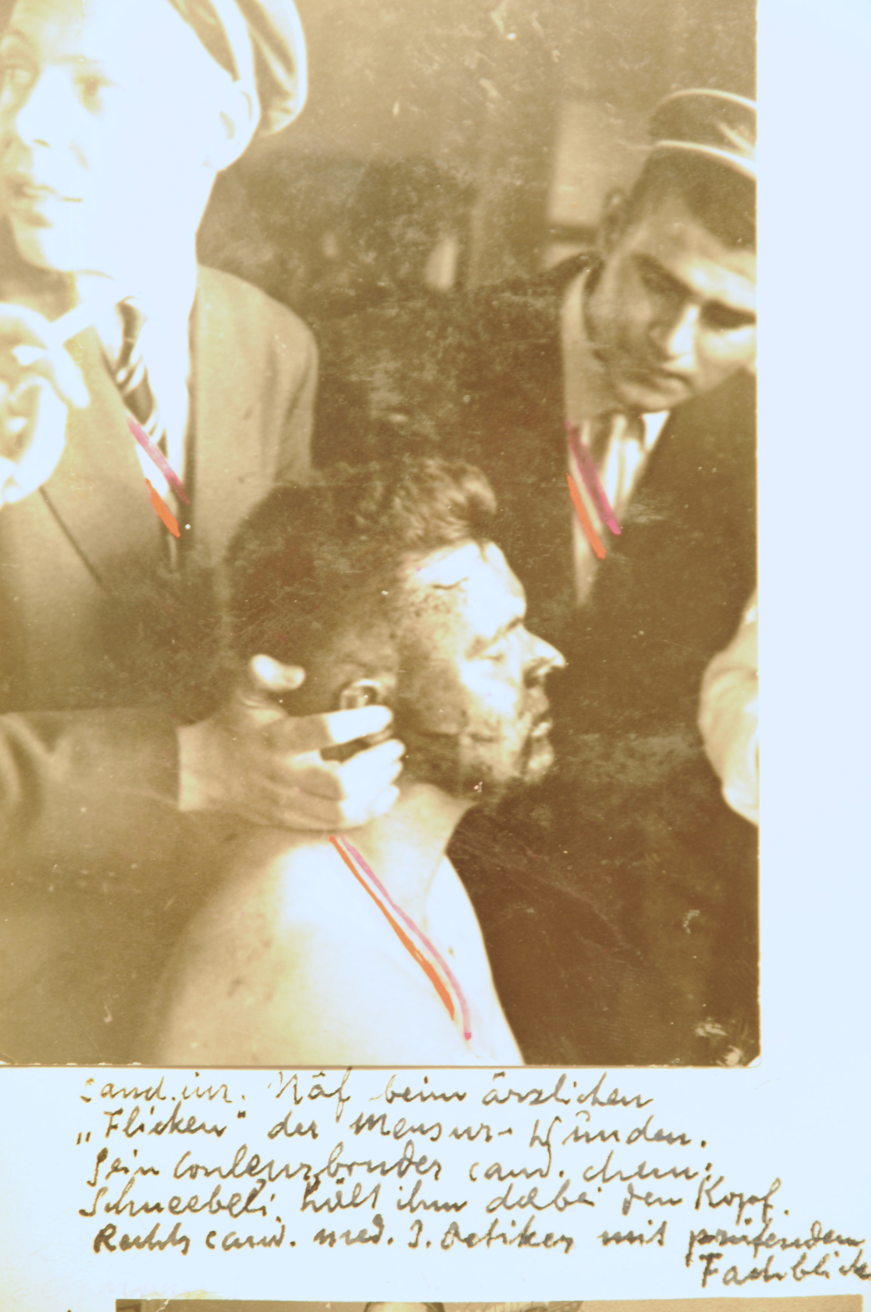Die Rhenania ist “freischlagend”. Das bedeutet: Wer sich duellieren will, der kann. Aber niemand muss. Die letzte Säbelpartie wurde am 2. Juli 1953 gefochten. Heinz Näf v/o Schnauz war der Letzte von uns, der sich duelliert hat. In den mehr als 60 Jahren danach hat sich kein Rhenane mehr gefunden, der Fechten lernen wollte. Aber wir halten dich bestimmt nicht auf, wenn du dich dazu berufen fühlst. Aber eben: Schnauz nach der Säbelpartie und Jakob Oetiker v/o Yak mit Fachblick.